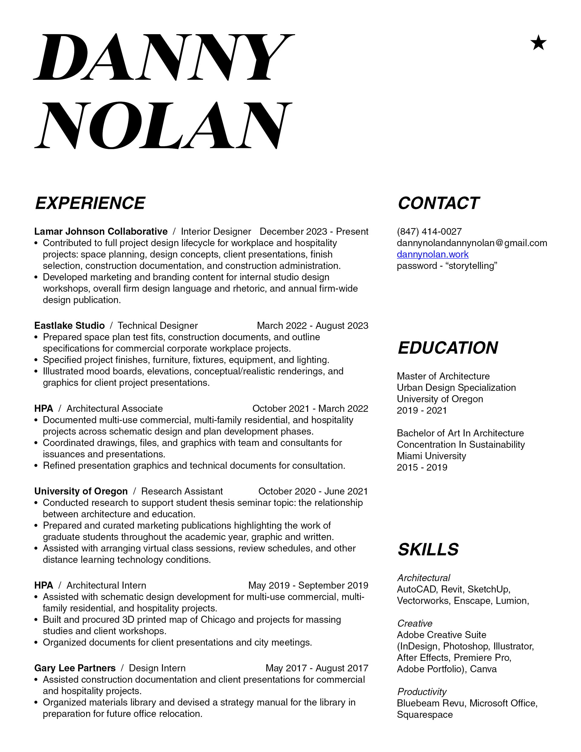 Hi, I'm Danny! I'm a Chicago based designer with four-ish years of experience in the Architecture & Design industry, specializing in commercial interiors. I believe that design is a fundamental shared experience communicated through architects, designers, and artists. As a designer, I’ve spent my academics and the early stages of my career obsessing over how to craft exciting and meaningful narratives and stories of the built environment. Outside of the office you can find me tending to my houseplants, learning a new craft, at a concert, or rollerblading to the beach on a warmer day!