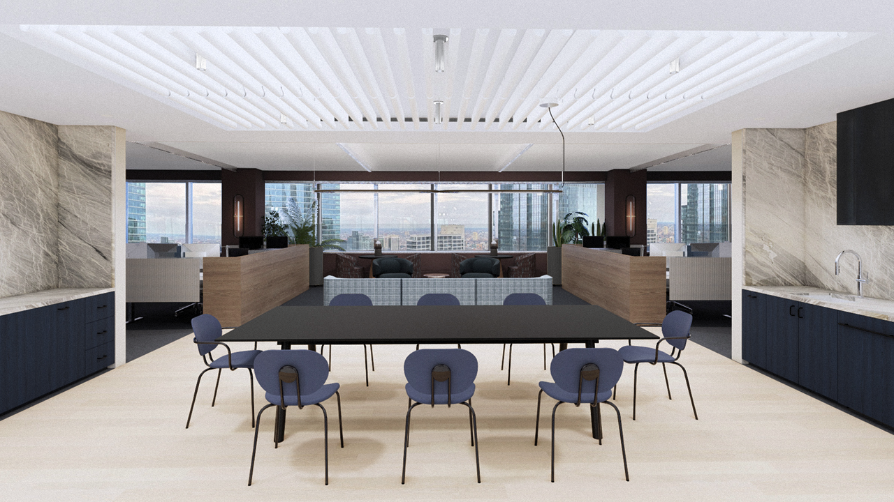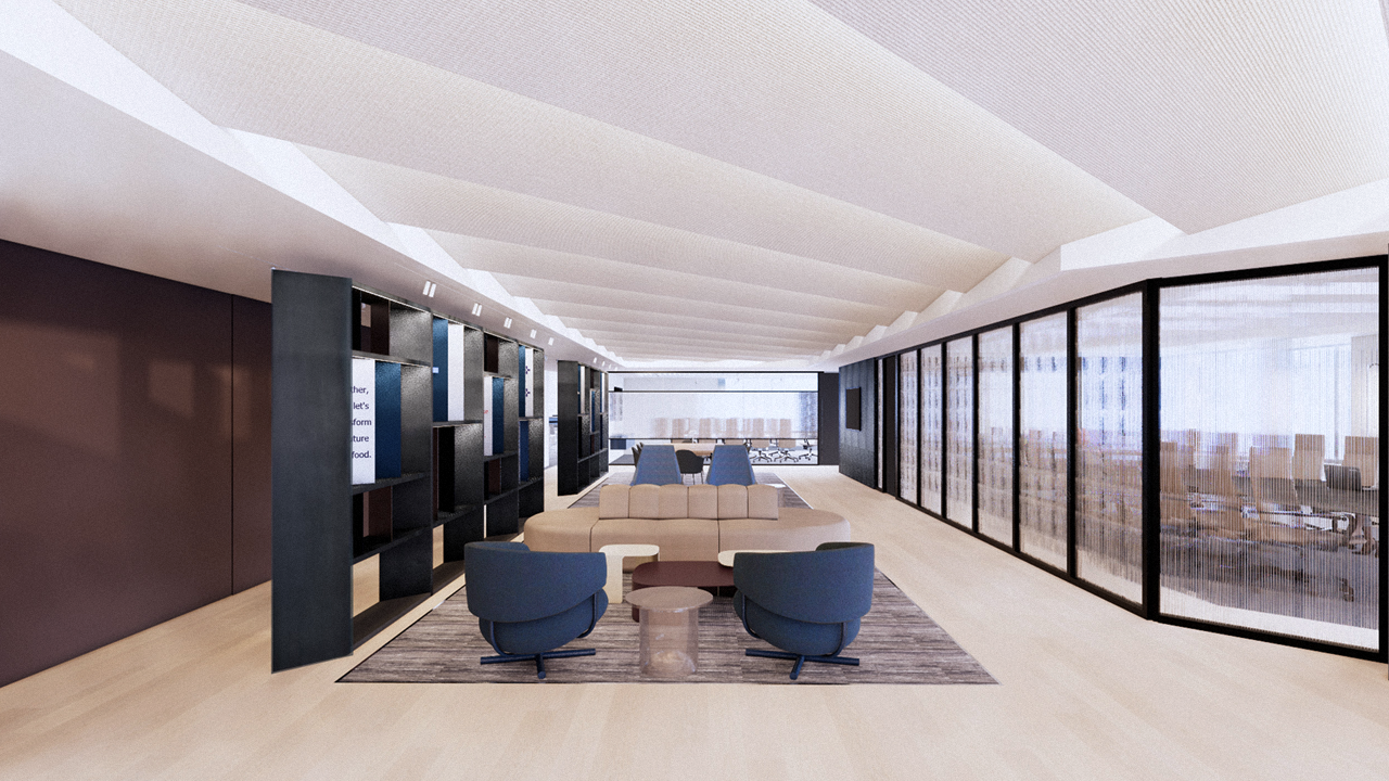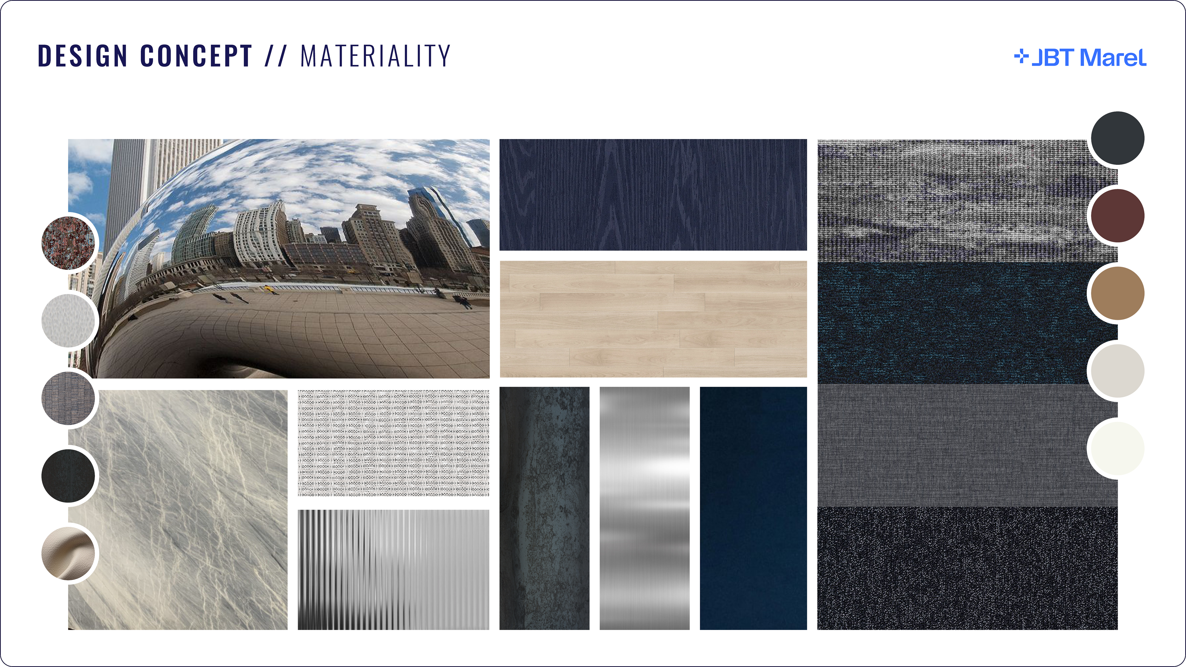 The material palette is a reflection of JBT Marel’s visual identity and strategic pillars. The use of textural and geometric metals, cool stones, and deep navy veneer creates a sleek and slightly industrial atmosphere. The softer, energetic, burgundy and cranberry tones pull the brand colors into the space and warm up the atmosphere a little bit. We threw in a picture of the Bean to strengthen the overall concept and really emphasize this space as a natural extension of the city’s skyline.