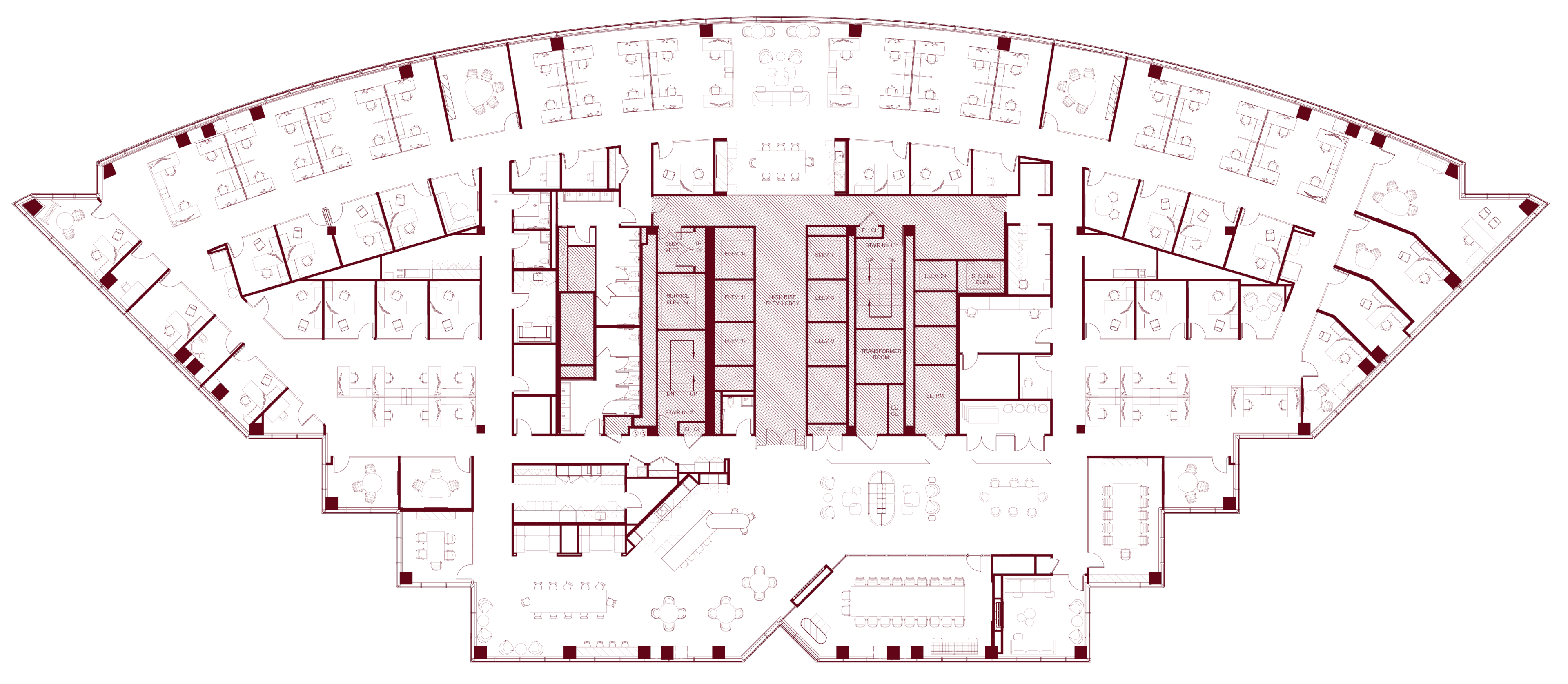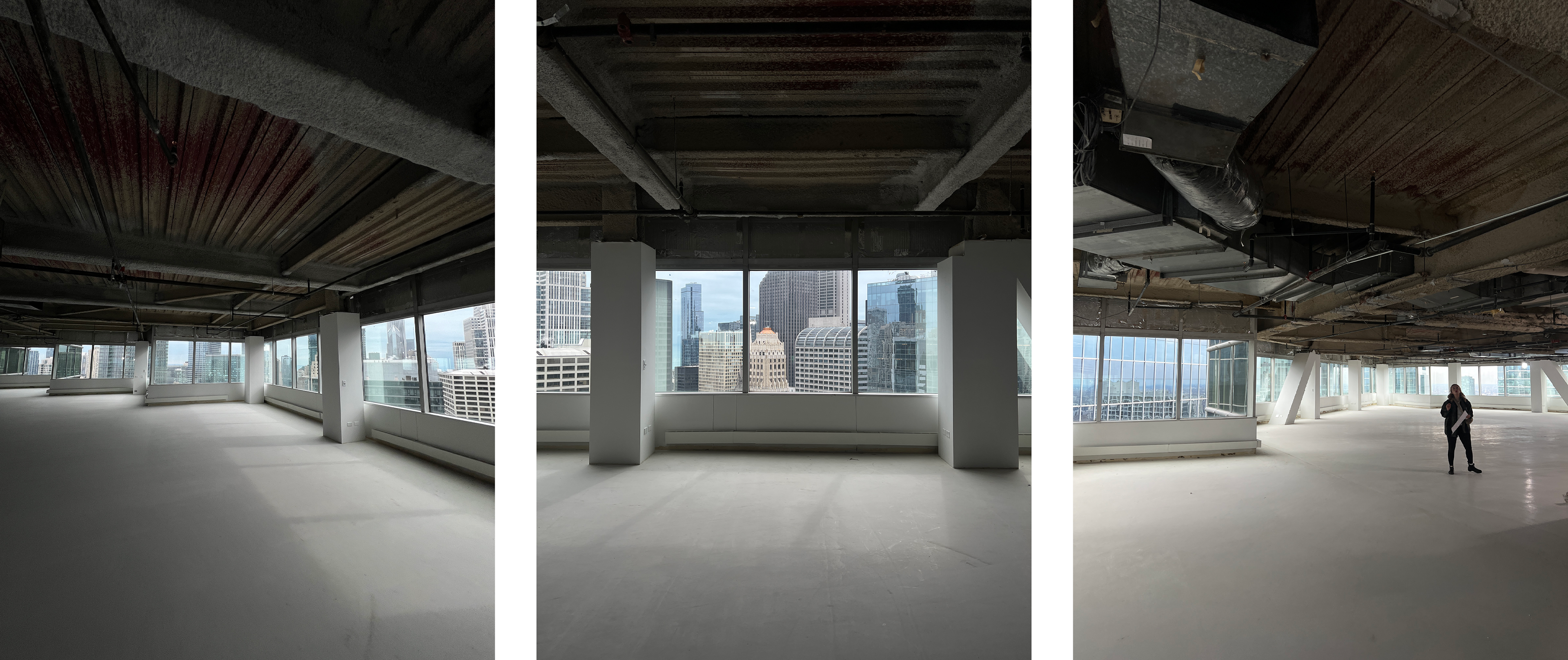Located on the 34th floor at 333 W Wacker, the tenant space has incredible 360 degree views of the Loop, lakefront, and Chicago River. One floor below the building's tenant amenity floor, the existing space had shorter ceiling heights than preferred and a bit of equipment scattered throughout the ceilings that we had to design around. Additionally, the curved geometry of the building posed space planning and alignment challenges that took a handful of iterations to come to the best solution.
