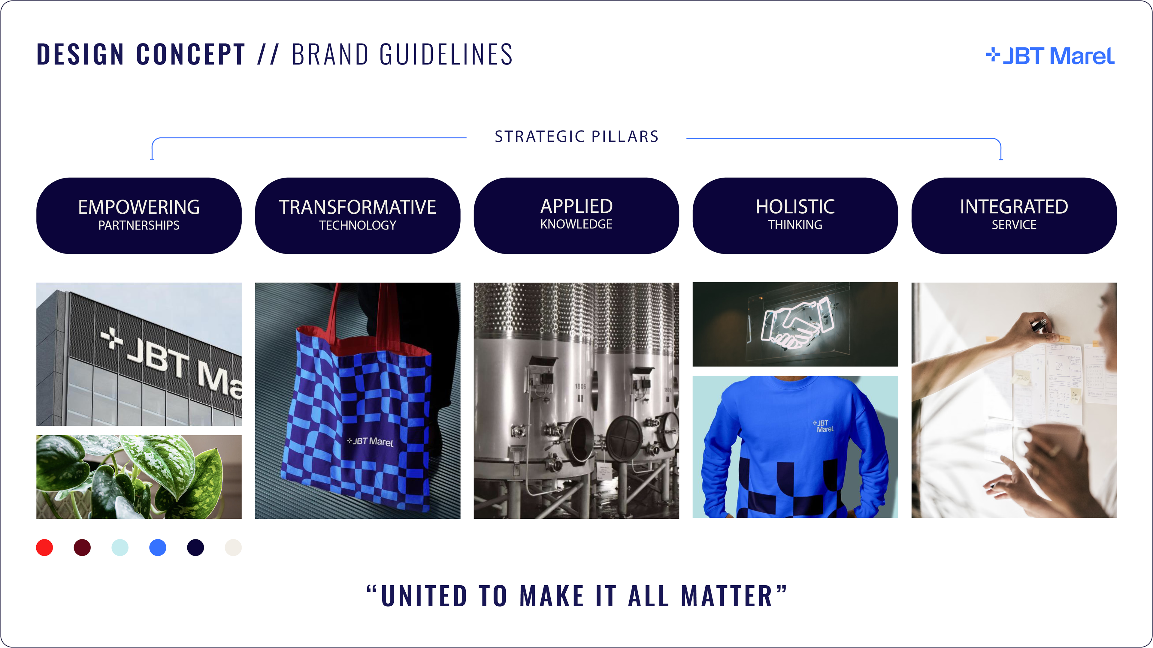 JBT Marel’s identity is built on a foundation of dynamic brand guidelines, including strategic pillars and a sophisticated color palette. Throughout the design process, we consistently came back to these ideas to ensure decisions we made as a team were a direct reflection of the company’s core values.
