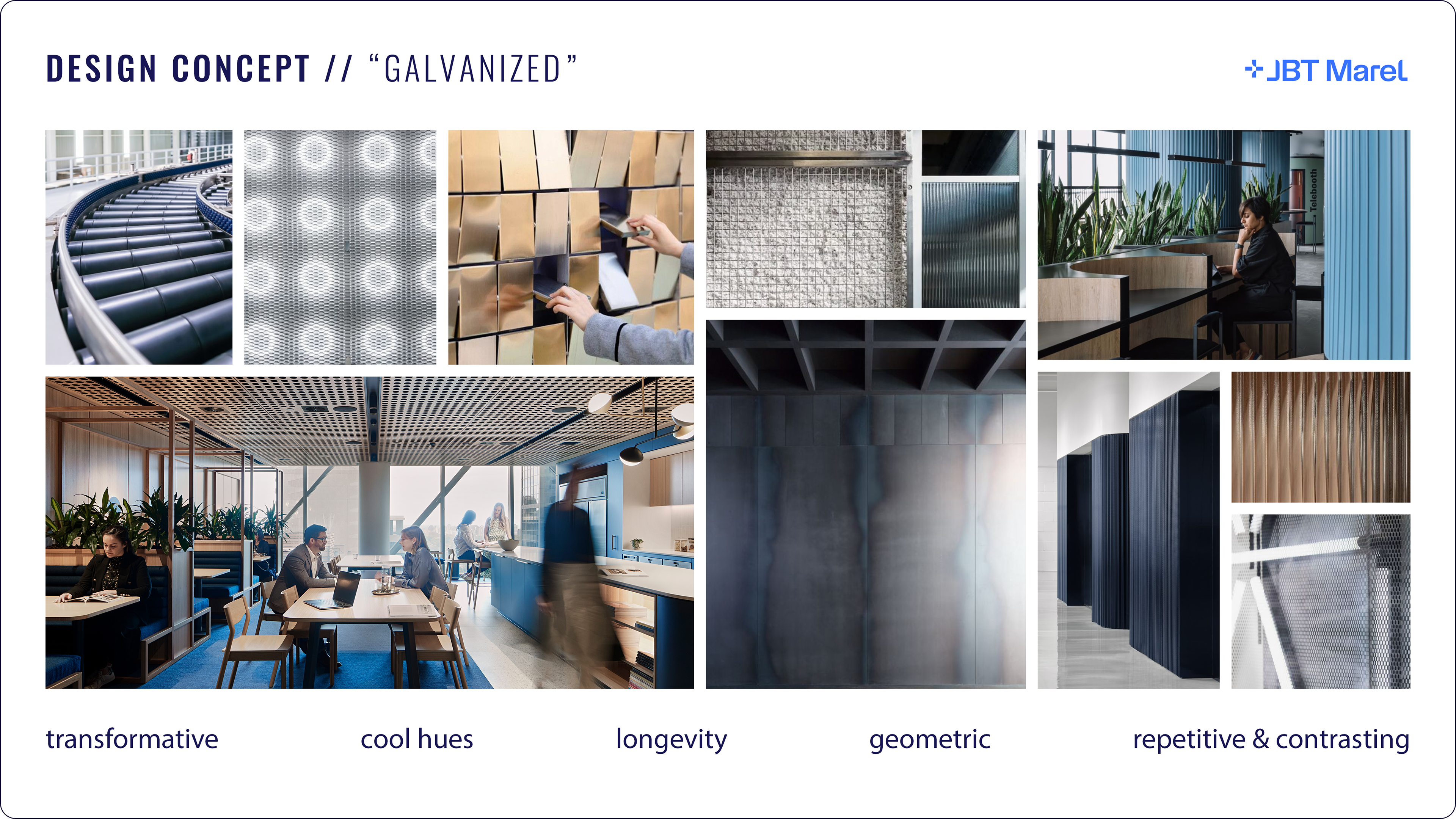 The design concept centers around the concept of galvanization. Inspired by the process of strengthening metal, we translated ideas of resilience, longevity, and durability into the built environment. We aimed to integrate these grounding ideas with the previous thoughts through materials, finishes, furniture, program layouts, lighting, and even plants. As a team, we really wanted to make sure the concept of the space was as immersive of JBT Marel’s brand as it could be.