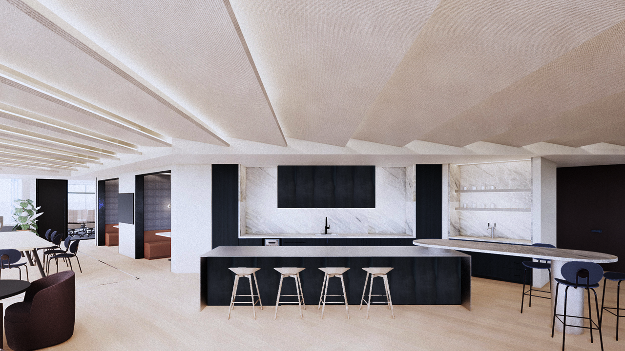 The existing curve and angled conditions were challenging to work with, but once we embraced this challenge in the plan, everything fell into place. The space is organized into four distinct zones: a hospitality focused reception and work cafe, private offices, collaboration rooms, and an open office. The “front of house” hospitality zone serves as an “arrival” for users of the space, offering a variety of work settings from the moment they enter. The boardroom utilizes a NanaWall system, providing flexibility to open up with the reception area for town halls or social gatherings. Views and daylight are prioritized for select private offices and a majority of the open office workstations, while dispersed focus rooms provide equitable access to quiet space throughout the floor plate.