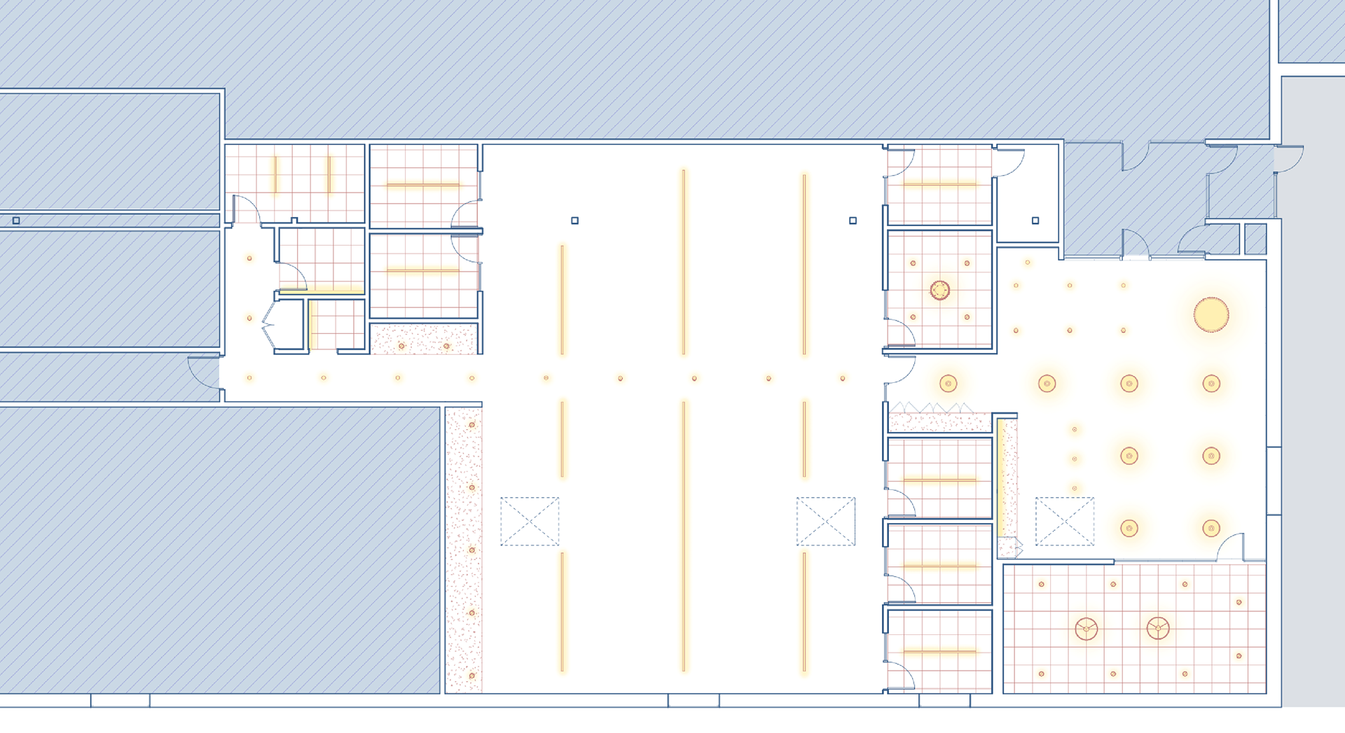 The existing conditions were challenging, yet inspiring! The white box space offered us a blank canvas for our vision, while the layout presented obstacles such as lack of perimeter windows, a handful of skylights, 18’ ceilings, and an intricate building structure. We worked through a handful of iterations with the design team and client to ensure the space would work efficiently for their needs.