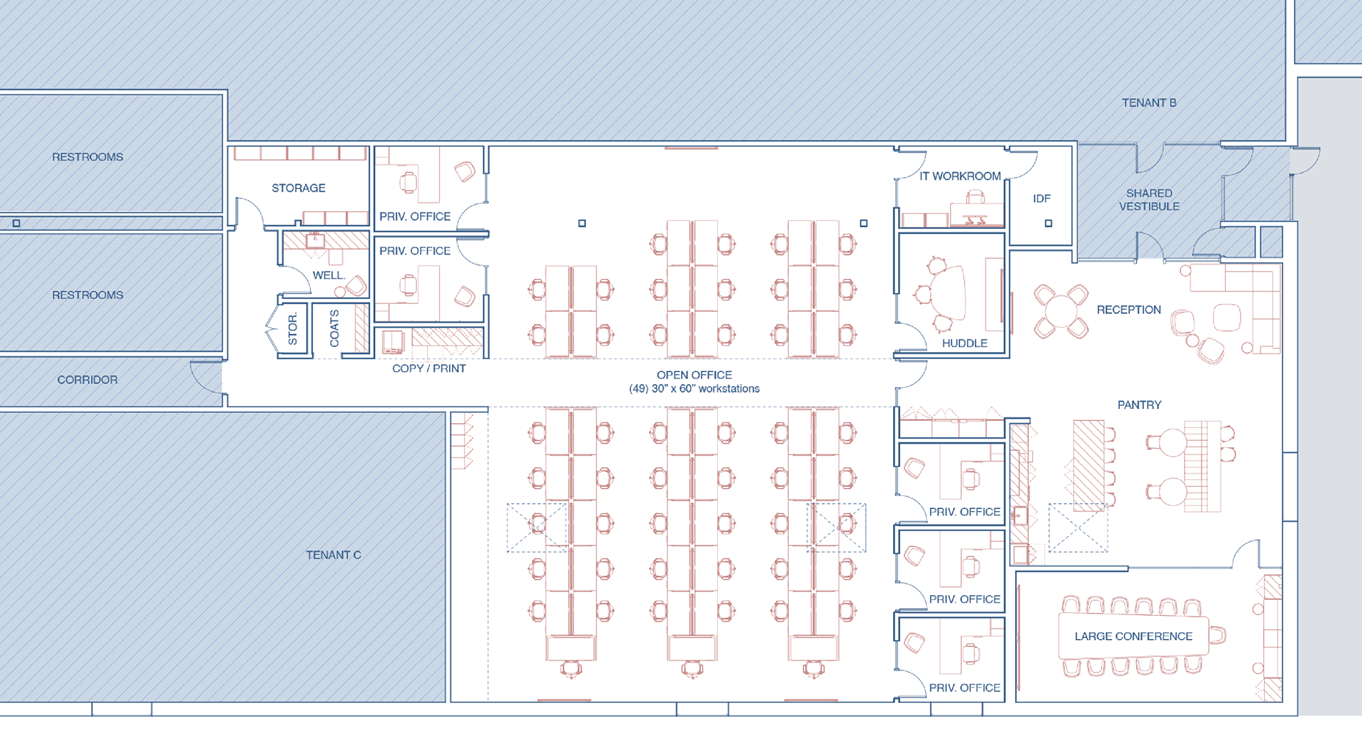 A simple, yet efficient design, the space plan applies traditional office planning strategies while utilizing areas for multiple purposes. Through the shared vestibule, users walk into a multifunctional touchdown lounge space that also operates as a reception. The open pantry under the first existing skylight of the space acts as a break room and as a large town hall presentation space. To top off typical front of house functions, the large conference room is adjacent to the entry for ease of client meetings. The remainder of the tenant space is filled with the call center, open office, private offices, and supporting spaces like a wellness room, storage, and other back of house functions.